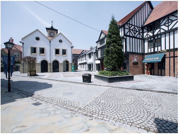 Shanghai urban planners are trying to preserve the center of the city by not building any more new highways, and by setting up 9 satellite cities, or “New Towns” far out in the Shanghai suburbs. But they need to attract people out of the city, into the outskirts–a tough job, unless you can create an atmosphere and lifestyle that one can’t find downtown. Thus the 9 theme cities, 7 based on the architecture of the UK, Italy, Germany, Spain, Sweden, Holland and Canada.